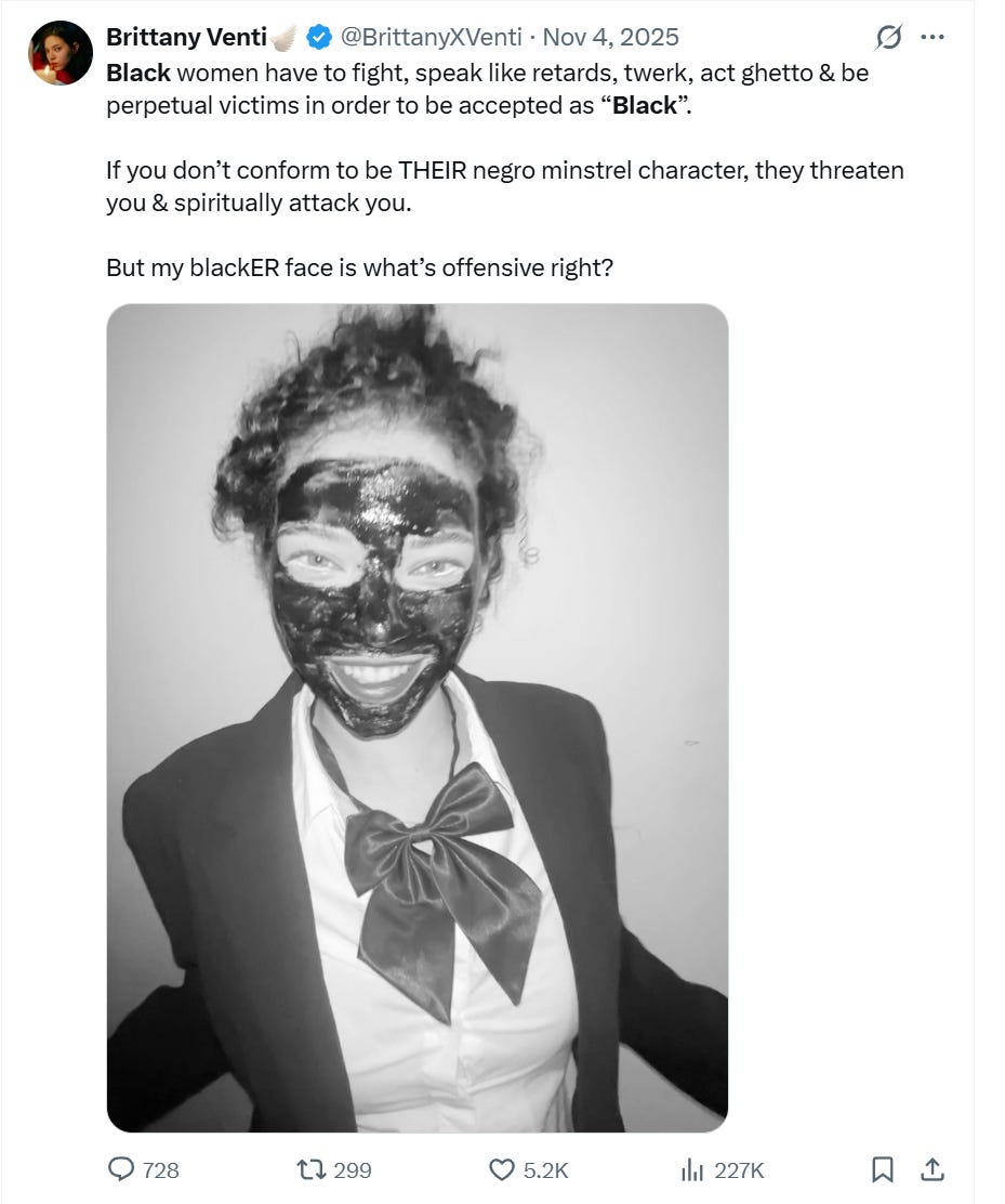 I did BlackER face and got around 80 milion views total, and many people were pretending to be offended by it. There is an obvious surface level edgy inflammatory aspect to this given the history of blackface but I chose the medium to show the irony of the expectations set for me by the “Black community”.
